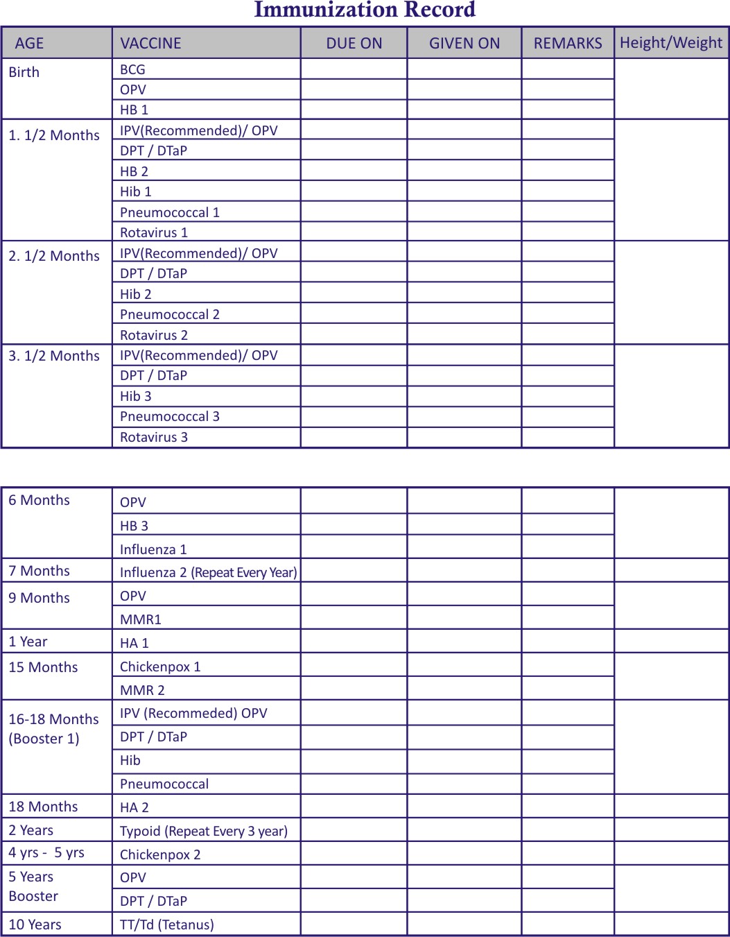 | IPV: 3 Doses- 0, 2, 8 Months Hep-B: 3 Doses- 0, 1, 6 Months | |